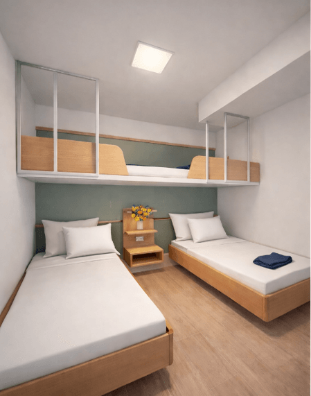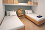 The interior layout features a main bedroom with a double bed, while the second sleeping area includes one single bed and a bunk bed, comfortably accommodating up to five guests (4 adults and 1 child aged 4–11).