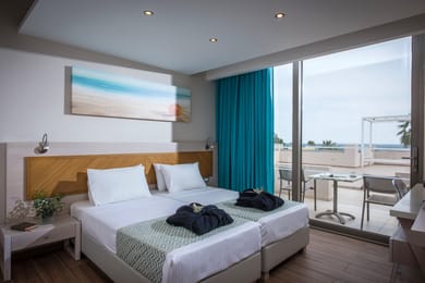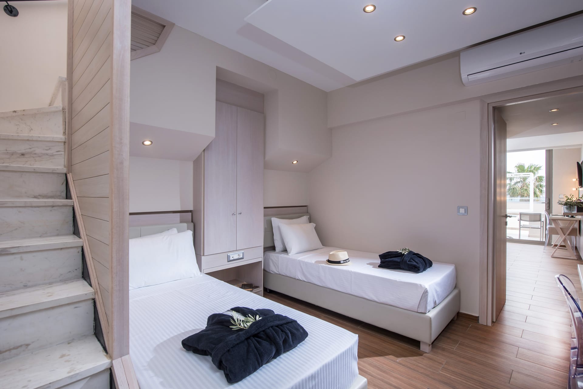 Our Split-Level Suite connected to a Superior Double Room offers a spacious and versatile accommodation option, ideal for families or friends. With a total size of 70m², this combined unit comfortably accommodates up to 6 guests, providing both privacy and togetherness. Τhe suite spans two levels: the ground floor features two single beds, while the upper floor hosts the master bedroom with a double bed and a bathroom with a bathtub. The adjacent Superior Double Room includes a comfortable double bed or two single beds, its own bathroom with bathtub, and a private entrance, connected to the suite via an internal door for convenience.